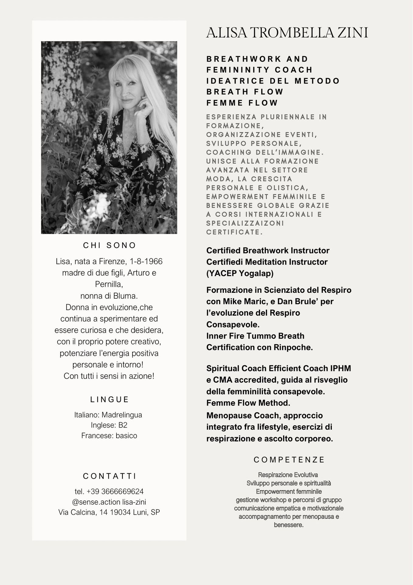 Lisa Zini Trombella è un’istruttrice qualificata di respirazione Yogalap, meditazione e consapevolezza, con una formazione continua presso esperti internazionali. Il suo metodo Breath Flow unisce pranayama, movimento e Qi Gong per favorire benessere emotivo e fisico.